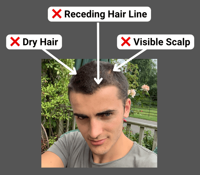 In my picture down below, I marked a few indicators that show common signs of non-genetic shedding and hair thinning.